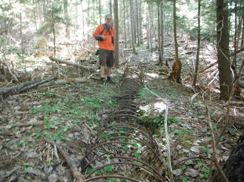 Below are two photos which were provided to me by Michael Parker c2014. They provide two views of the former pipe, in situ, on its north end not far from the former mill site. The individual in the photo may be Jonathon Riley, formerly a reporter for The Digby Courier, and the individual who hiked, solo, across Nova Scotia in Dec 2020!