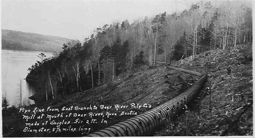 Copy of Photo from the NS Archives showing the fresh water supply pipe for the Bear River Pulp Company mill c1924 traversing the hillside below Commander Hood’s home on the Chute Road. This same photo was displayed in Water Under the Bridge, a 2001 compilation of Bear River history from 1920 to 1980 and provided to the Bear River Historical Society by Denzel and Madie York