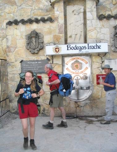 We spent the first 45 minutes walking out of the valley via one small village. We arrived at Bodega Irache, a commercial winery literally adjacent to the trail, by about 8.30. It was founded and originally run by monks. It has a set of taps attached to the building in a little alcove courtyard – with a mounted web cam (it is on the Net!) – which dispense water and red wine for the pilgrims. Unfortunately the wine tap only operates from about 9 am to 5 pm so we were out of luck. We did manage to squeeze out a few dribbles just to convince ourselves that the thing was real. A short distance on we came to a juncture where the trail splits with the north branch going down in the valley and through a number of villages, and the south branch up on the southern ridge and through much forest land. We elected the southern route to allow us to walk in the cool shade of the trees. Good choice! At one point we passed what looked to be a substantially constructed shooting stand (empty shotgun cartridges below) which put its observers just above the tree line. The view was quite spectacular in the yellow hazy light of morning with rounded peaks off to the east from whence we had come, and the broad valley bordered on the north by a limestone-capped mesa gleaming white in the morning sun.