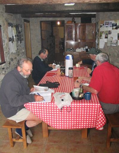 The day saw some showers in the morning, then some sun, and a whole bunch of cloud. Much of the trek was above the tree line, though the trees were gone a long time ago on the French side; some interesting hardwood in some of the valleys. Lots of sheep and we walked thru one flock apparently without a shepherd. A herd of some 20+ horses appeared to occupy the higher elevation grasslands; a number of local springs appeared to be fenced off to keep the animals out. We later heard that the horses were destined for the meat market in Paris. Saw a number of vultures and one falcon. We noted the presence of a number of mounds of fresh earth apparently pushed up by some kind of ground squirrel – never did see the beastie.