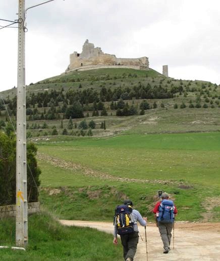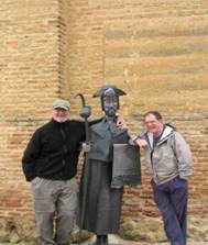 In leaving Pamplona for Puente la Reina we walked past the University of Navarre on the west side of the city. It took us 45 minutes to get out of the city and then we traversed on paved sidewalks for half an hour. Then the work began – muddy farmer’s tractor trails across winter wheat fields, all up hill, to crest the major ridge west of Pamplona – Mount Sierra del Perdon – which tops out at 750m. There was a series of pilgrim sculptures at the crest mounted by the electrical company operating a huge adjacent windmill farm. The mud covered the trail for 90% of the way up and covered the boots and added weight – a short legged English lady indicated that for her the climb was worse than the Pyrenees . At the top of the ridge the trail went under, and within 50 meters of the base of, one of the modern windmills that was part of a farm numbering some 60, but probably more were obscured by fog. We passed the Italian guys twice, and I caught one guy in a picture about halfway up and he ensured I was aware that he was 72 years of age. He had done another major hike at 68 (John’s age) and scoffed that he was some 9 years older than Mike!