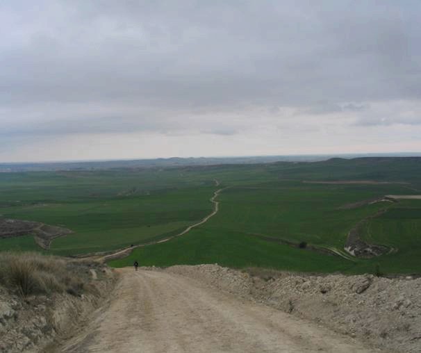 At about 9.30 am we reached a small village with a bar – new – and open. We were the first customers of the day and had coffee and a piece of potato and cheese omelet – really good! From the village the trail went down into the valley and across to meet up with the other section. Numerous peregrinos have caught us as the north route is the shorter of the two; we estimated we had lost 30 minutes. The rest of the day appeared as if it will be spent on a gravel road which winds westward off in the distance through the valley. Not a cloud in the sky, a comfortable breeze and perhaps 680 F – ideal for walking.