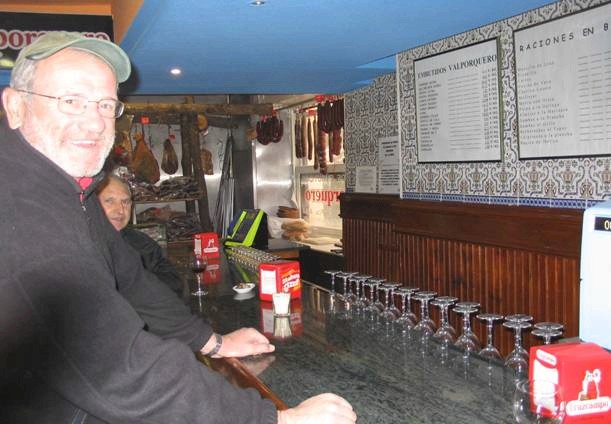 Estella is about 13,000 in population, a really well-appointed square in front of about three churches containing many restaurants. We had a snack of pickled octopus, a local delicacy at a bar at the edge of the square – resembled squid. Our conservative John actually tried it, an activity he has become much more involved in this trip than last….trying new things! I like these small bars – quite a local quality to them. I have been sitting here writing for some time while waiting for the guys to come back from Mass and no problem. I just used the Internet for 45 minutes for 1.5E – a steal!  There have been a number of peregrinos in here over the last two hours – being close to the albergue and cheap helps. Unfortunately some of the Spaniards did not like the German/Belgian beer and left. They sell local wines (80% red) and one local brandy from the bar; I also can see pickled artichoke hearts, white asparagus, something that looks like beets, chocolates (some in shell format), some form of grain in a bag, cheese, and local sausages in their deli. Many locals appear to come to the door and peer in but do not enter. The Dutch couple and friend arrived and discussed the menu and whether they’ll stay. Management is re-doing the menu as I write and there was a major discussion about it with the Dutch couple. One other couple across street with camera spent 10 minutes examining the relief over door of a 1924 building. The Dutch couple sat down with the Majorcan with the bad feet. I thought at the time that maybe he was Dutch. The young kids in the bar obviously belong to the owners.