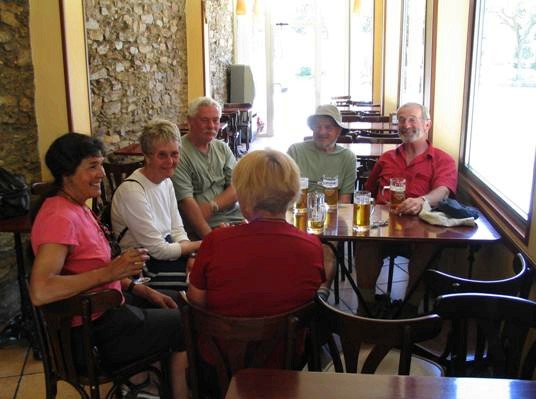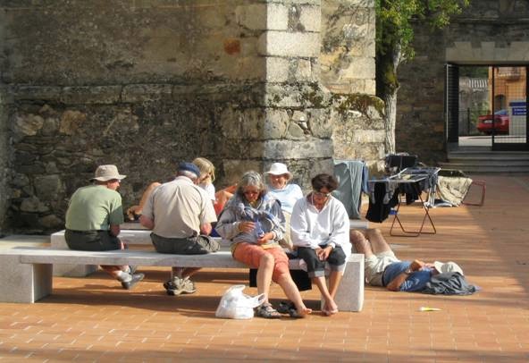 The routine for that day, generally followed for the rest of the trip, was to get cleaned up, wash clothes, and go out for a beer. A number of other pilgrims arrived at the same bar for dinner at about 2 pm . We then returned for a short nap, Mike went across the street to buy some grub for tomorrow, and John and I watched the action on the street, considerable going and coming of pilgrims, including the young American Jennifer from the day before, and our first encounter with the Majorcan Dane, Jean – his feet were bad and he was showing it. The girl he was with, attractive early 30s redhead, seemed on the contrary to be OK.